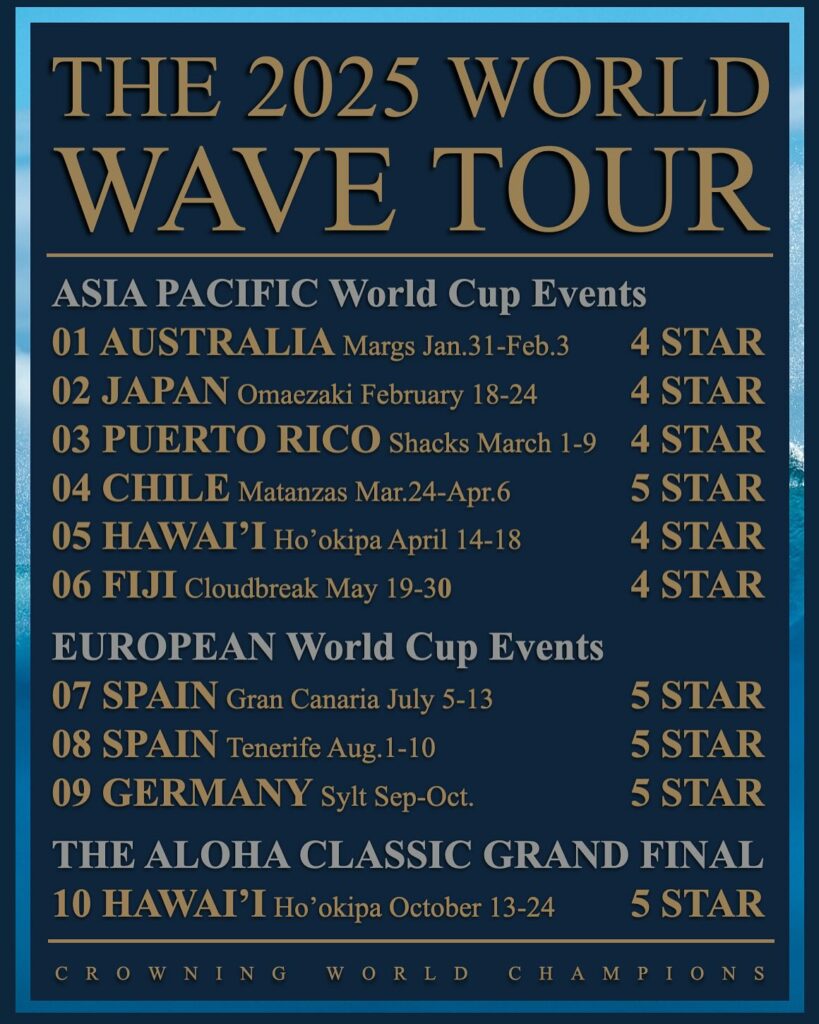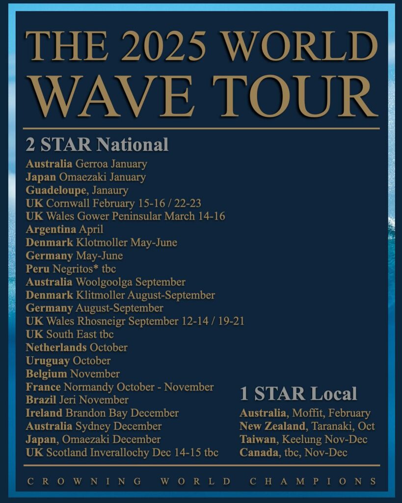 L’iwt devoilait le calendrier 2025 IWT/PWA ce weekend. De quoi décrypter la saison waveriding à venir avec cette année un peu moins d’étapes 5 étoiles au calendrier que la saison 2024. La saison des étapes 5 étoiles débutera au Chili fin mars, début avril avec ensuite les classiques PWA à Pozo, Tenerife (qui fait son grand retour à la normale) et Sylt en septembre-octobre pour terminer la saison à Maui pour l’Aloha Classic. 5 étapes majeures dans la saison donc où Le titre pro se jourera pour les hommes et femmes sur les 4 meilleures résultats.