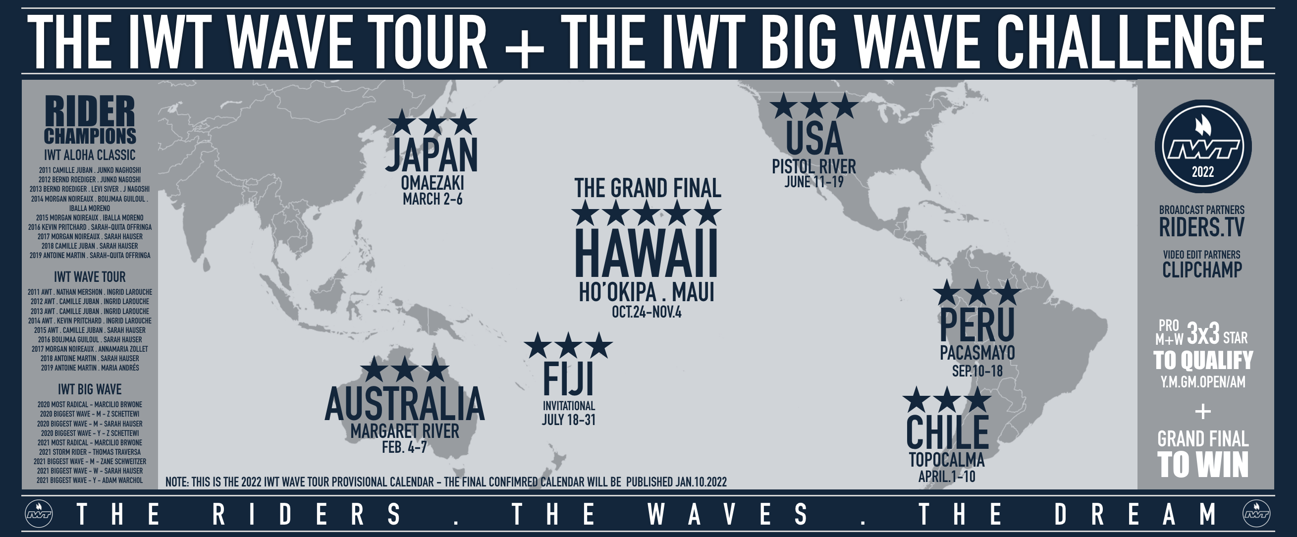 La saison débutera en février à Margaret River en Australie, puis les riders se retrouveront en mars au Japon, début avril à Topocalma au Chili, à Pistol River USA en juin. C’est ensuite à Cloud Break à Fidji en juillet que seront conviés quelques riders sur invitation. Pacasmayo au Pérou en septembre puis la super finale à Maui sur le spot d’Hookipa pour l’Aloha Classic en octobre/novembre.