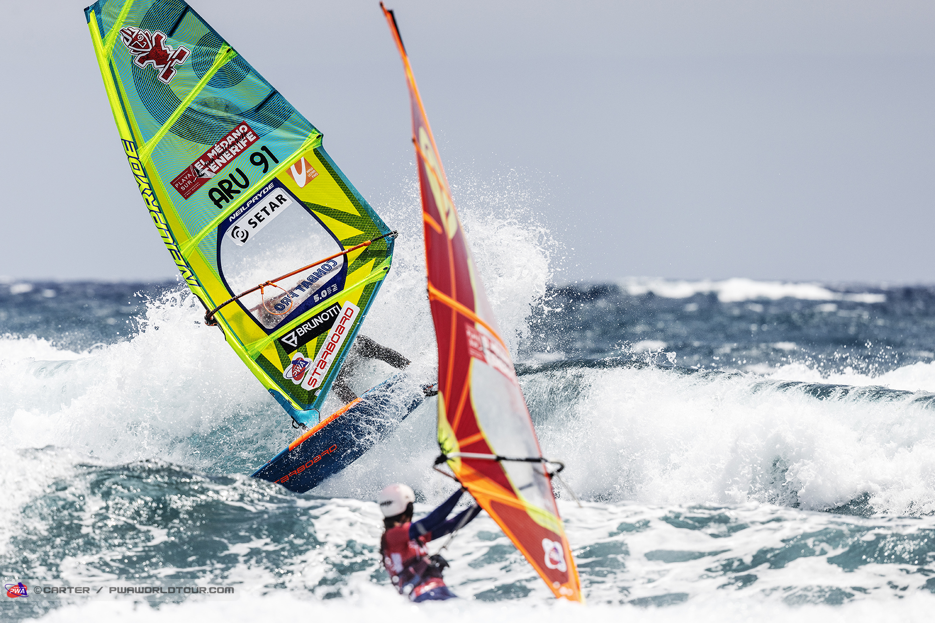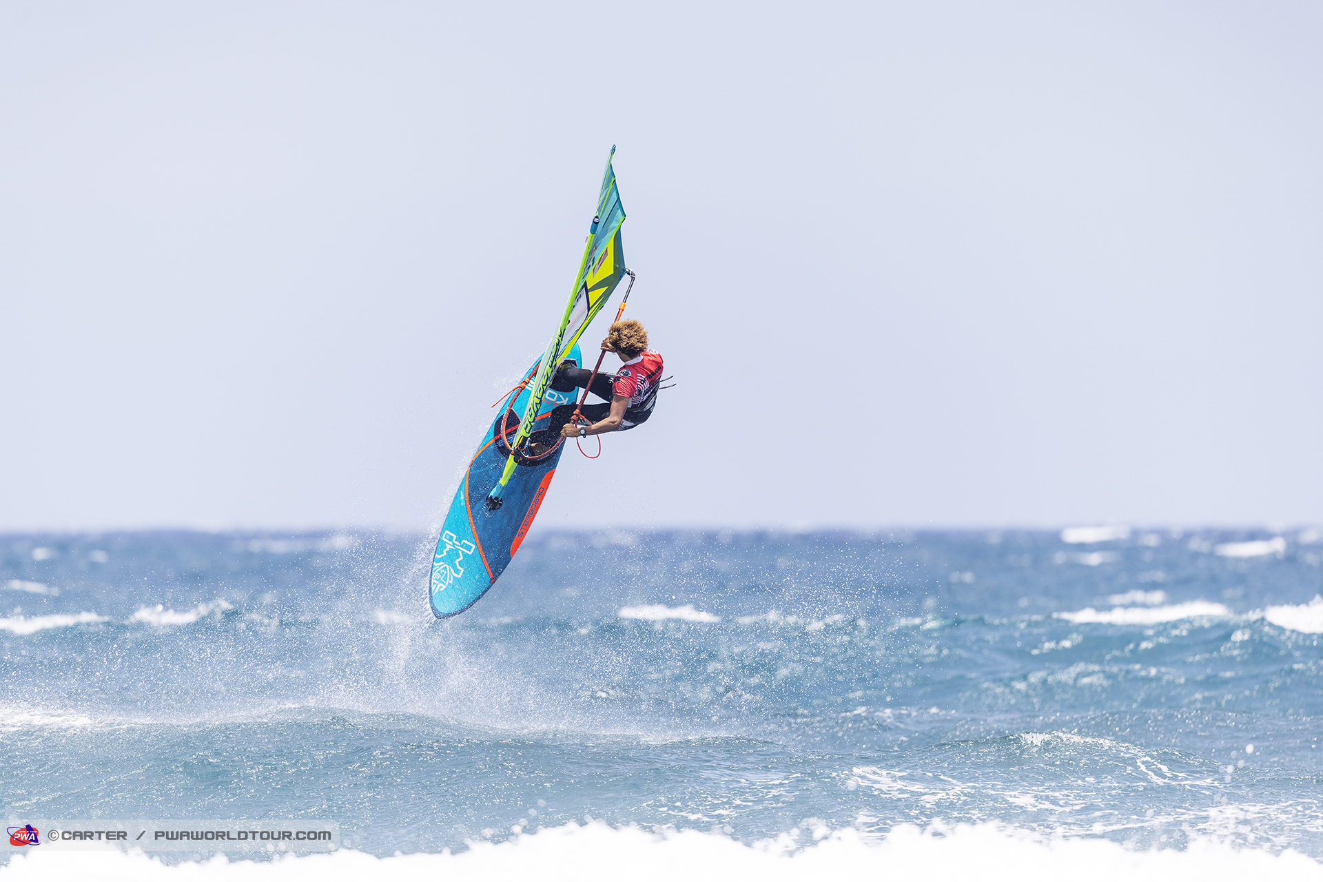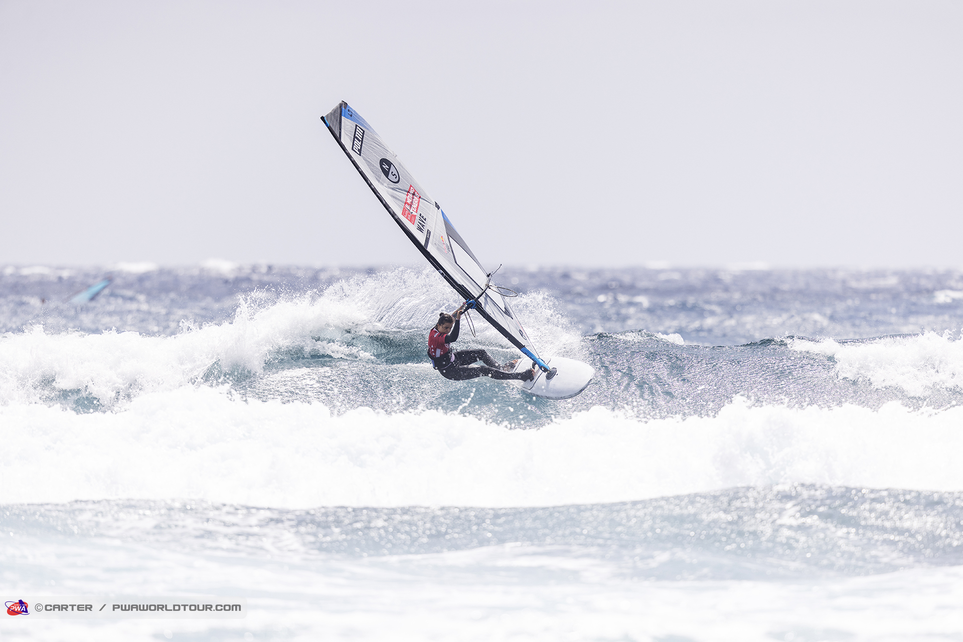 2eme journée de compétition et l’organisation décide d’envoyer le tableau féminin pro dans des conditions un peu justes en vent mais avec des vagues. C’est donc seulement 2 surfs qui sont comptabilisés jusqu’en demi finale, puis ensuite 2 surfs, un saut. Ce début de tableau féminin est donc plus ouvert pour celles qui sont moins affutées en saut.