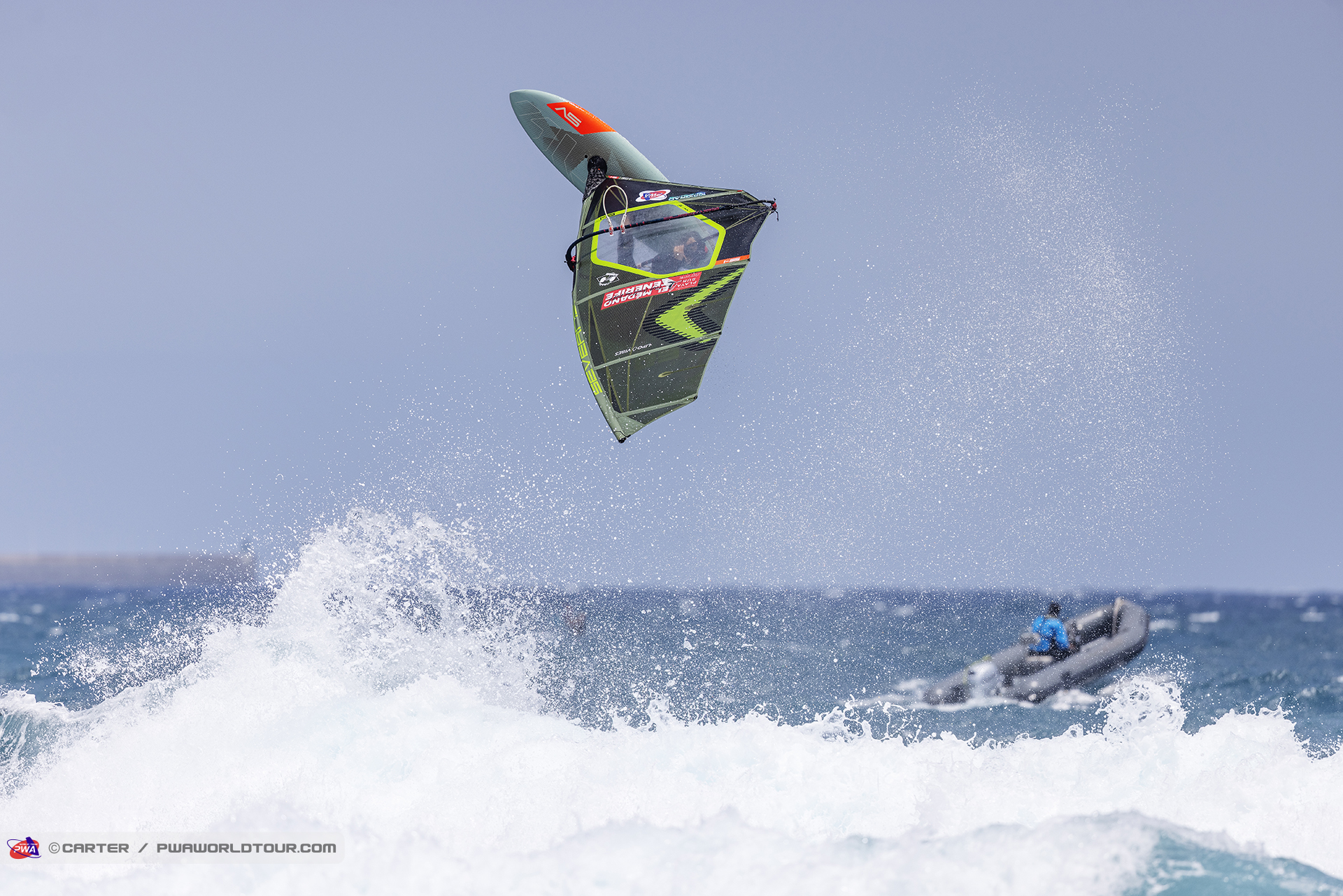 Un saut est comptabilisé en demi finale dans un vent toujours un peu juste pour s’exprimer en saut. Lina Erpenstein pose des le 1er bord un superbe backloop qui la place directement en tete du heat. Elle assure des beaux surfs et se qualifie aisement en finale avec Kiefer Quintana. Marine Hunter et Maria Barhens ne sont pas assez consistantes en surf et saut sur ce heat pour pouvoir passer au niveau superieur.
