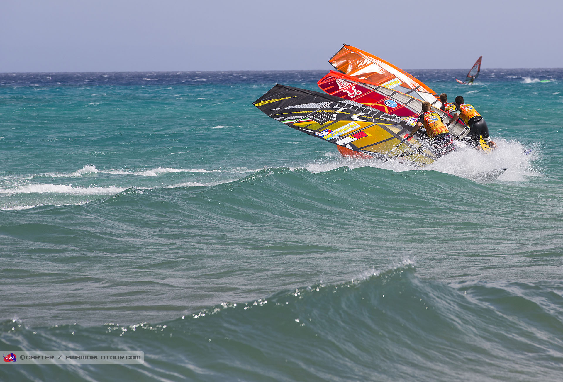 La compétition démarre fort à Sotavento pour les slalomeurs avec des conditions bien musclées comme le spot sait en délivrer avec 30 noeuds et un plan d’eau bien agité. 3 manches courues dans la journée et Albeau qui pointe en tête au général à l’issue de cette 1ère journée.