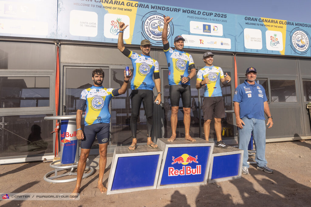 Dans la foulée de la journée d’hier, le chef juge decide ce matin d’envoyer la double élimination hommes vu que les conditions sont encore très fortes pour cette journée de dimanche. La compétition s’étire sur toute la journée avec quelques belles remontées comme celle Campello ou encore Liam Dunkerbeck qui s’affrontent pour une 5eme. Le duel tourne à l’avantage du jeune local qui bute au tour suivant sur Marc Paré bien décidé à remonté le top 3. Mais face à Marino Ghil, le canarien ne l’entends pas de cette oreilleet domine en saut.