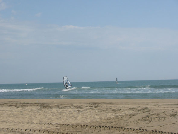 Là, deuxième surprise : les éoliennes qui annonçaient une renverse sont accompagnées d’un beau couloir de vent qui fait friser les vagues du spot du Mondial du vent.