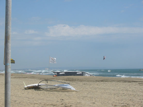 Pour ceux qui connaissent le spot… checker les drapeaux. Faux espoirs…. le vent retombera moins d’une heure après …